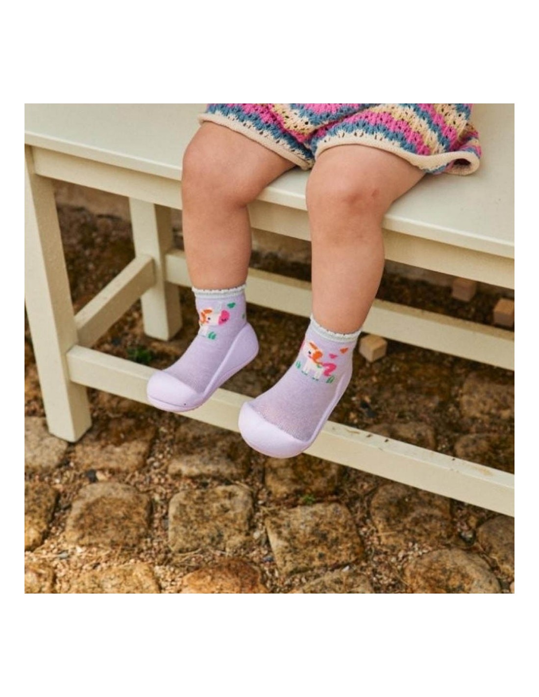 Zapatos para los primeros pasos de la marca Attipas, modelo Unicorn de color lila. Son muy fáciles de poner y quitar gracias a sus materiales elásticos y tienen una suela de goma muy flexible y ligera.