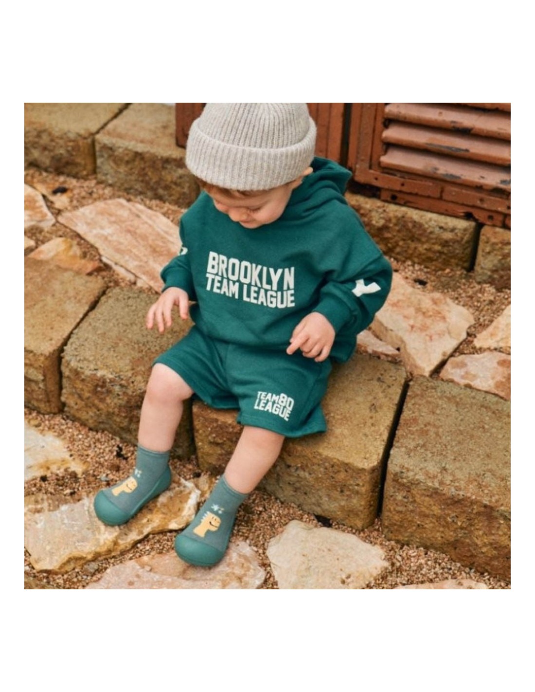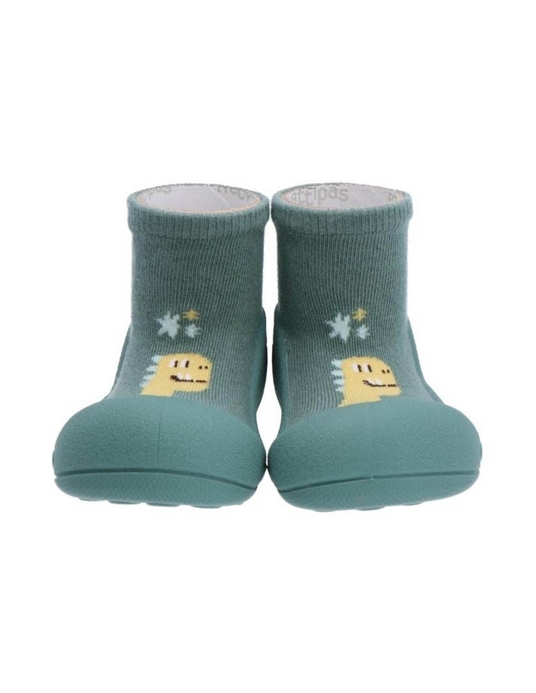 Zapatos para los primeros pasos de la marca Attipas, modelo Dino de color verde. Se ajustan perfectamente a los pies gracias a sus materiales elásticos, y tienen una suela de goma muy flexible y ligera.