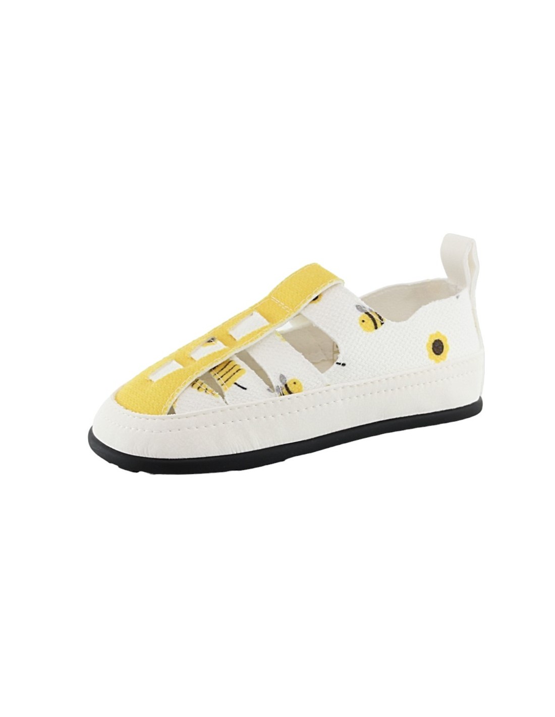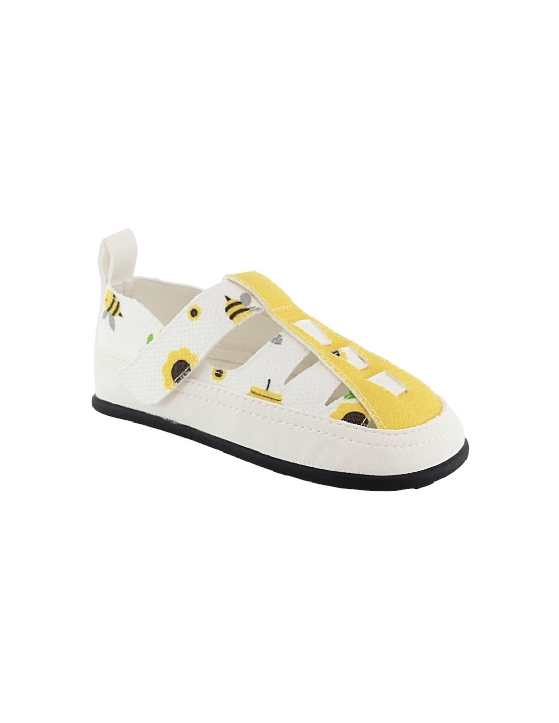 Sandalias cerradas de la marca Baby Lobitos, modelo de Abejas de color blanco con detalles amarillos. Son muy fáciles de poner y quitar gracias a su cierre con velcro. Calzado respetuoso con la anatomía natural del pie.