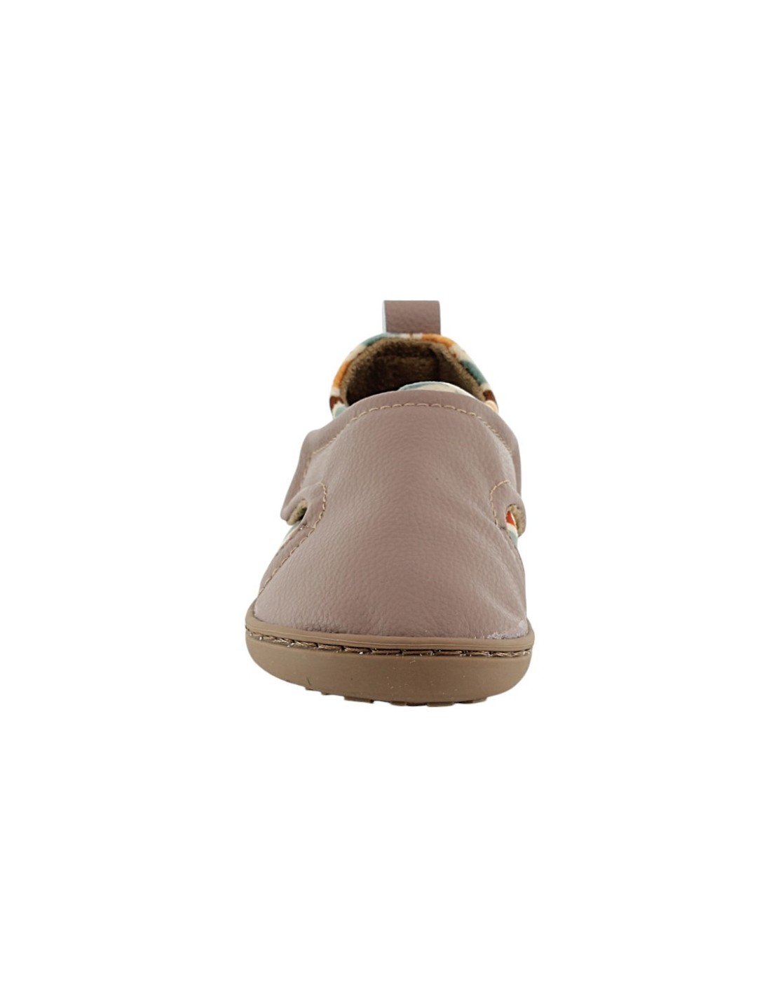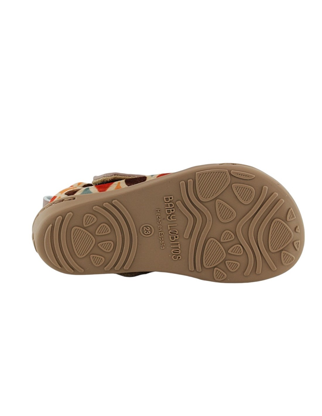 Zapatos deportivos de la marca Baby Lobitos, modelo Sesenta de color marrón con detalles multicolor. Este calzado barefoot tiene una suela muy fina y amplia que aporta la sensación de ir descalzos y una gran libertad de movimiento.