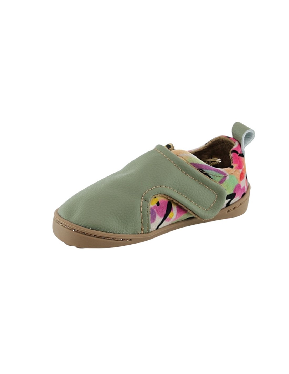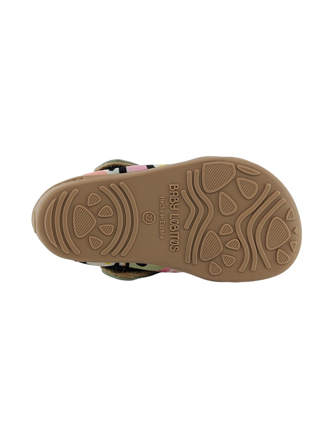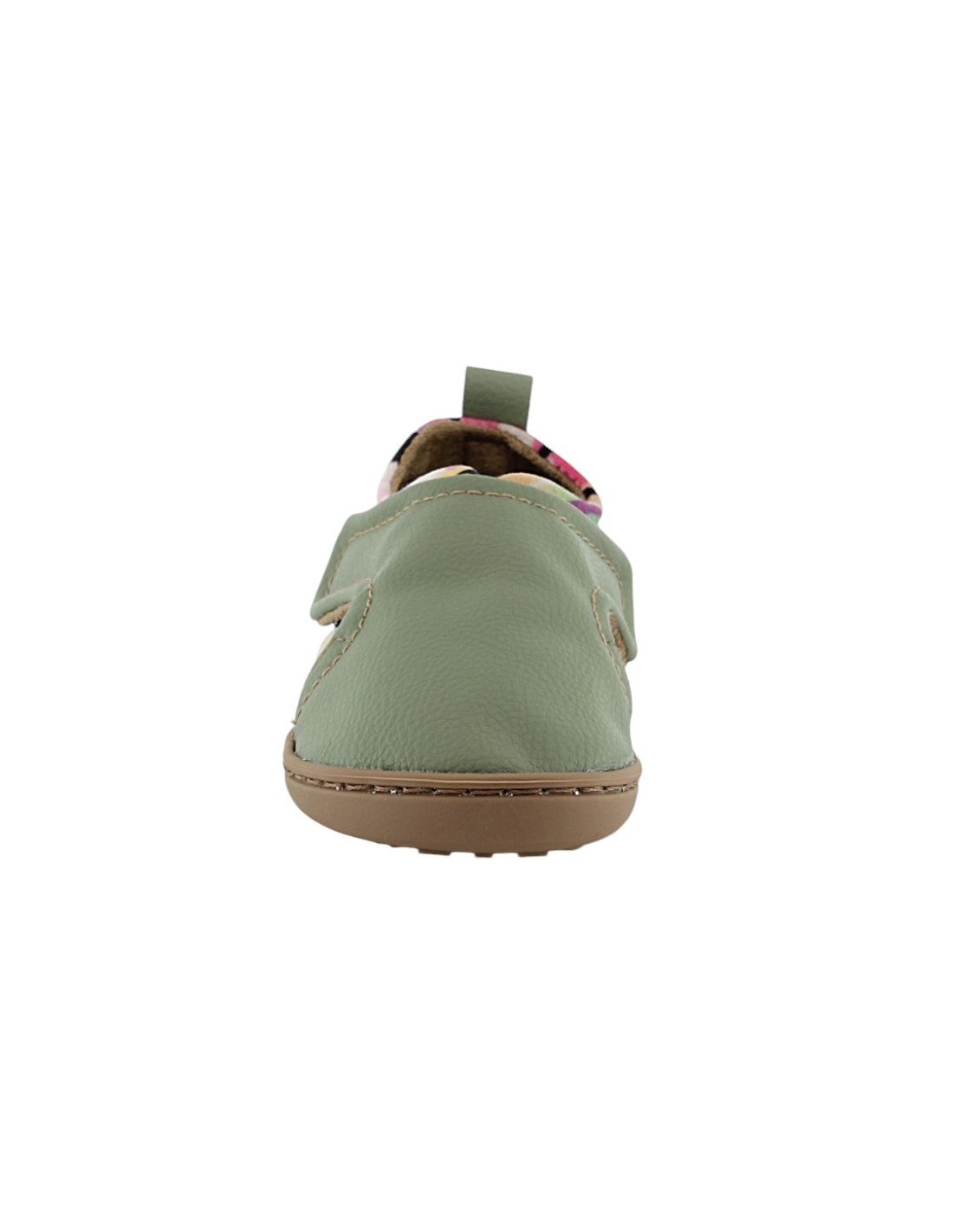 Zapatos barefoot de la marca Baby Lobitos, modelo Ochenta de color verde con detalles multicolor. Tienen una suela de goma muy flexible, amplia y plana que permite una gran libertad de movimiento.