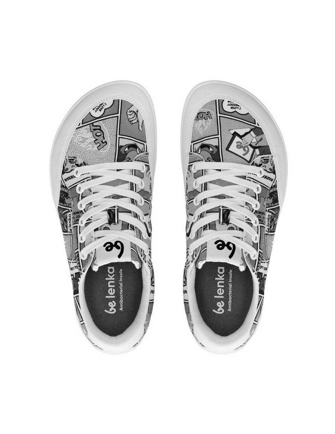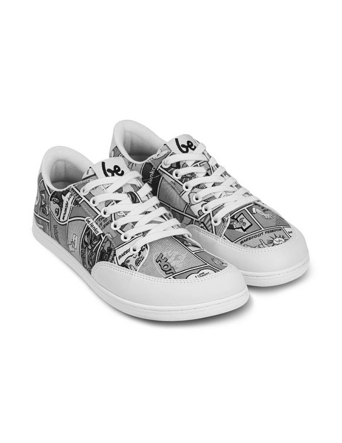 Zapatillas deportivas de lona de la marca Be Lenka, modelo Rebound Comics de color blanco y negro. Están hechas con materiales textiles de las mejores calidades. Este calzado barefoot tiene una suela de goma muy amplia, plana y flexible.
