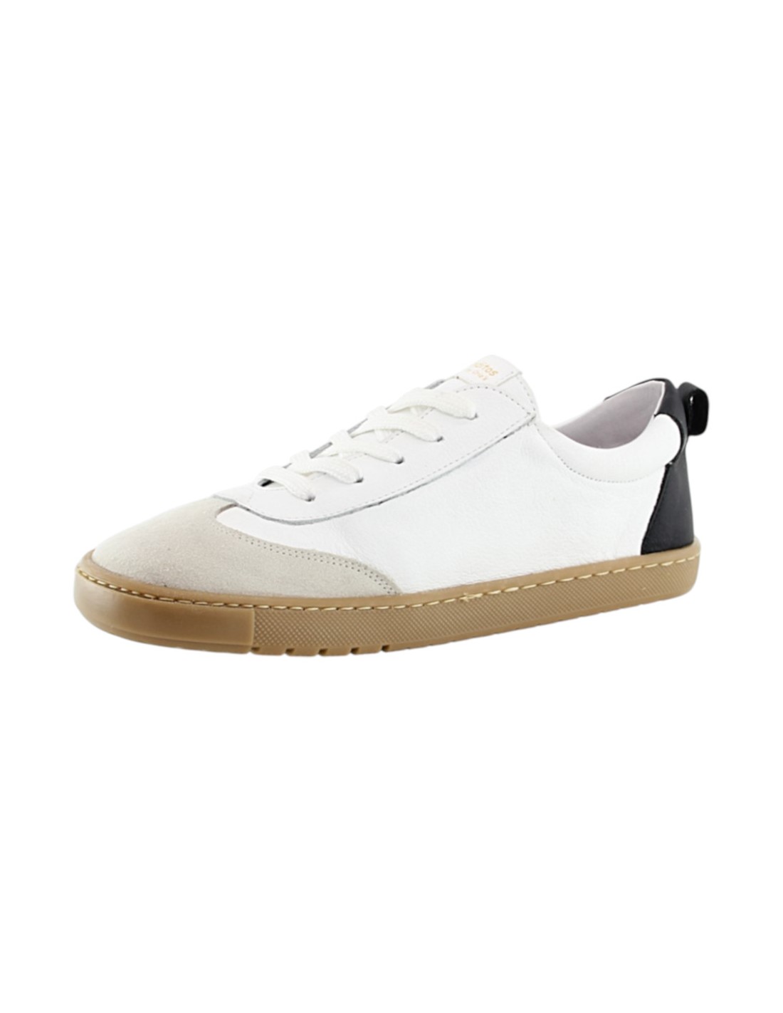 Zapatos barefoot de la marca Blanditos, modelo Delfin de color blanco con detalles negros. Están hechas con pieles de las mejores calidades y tienen una suela de goma muy amplia, plana y flexible que permite una gran libertad de movimiento.