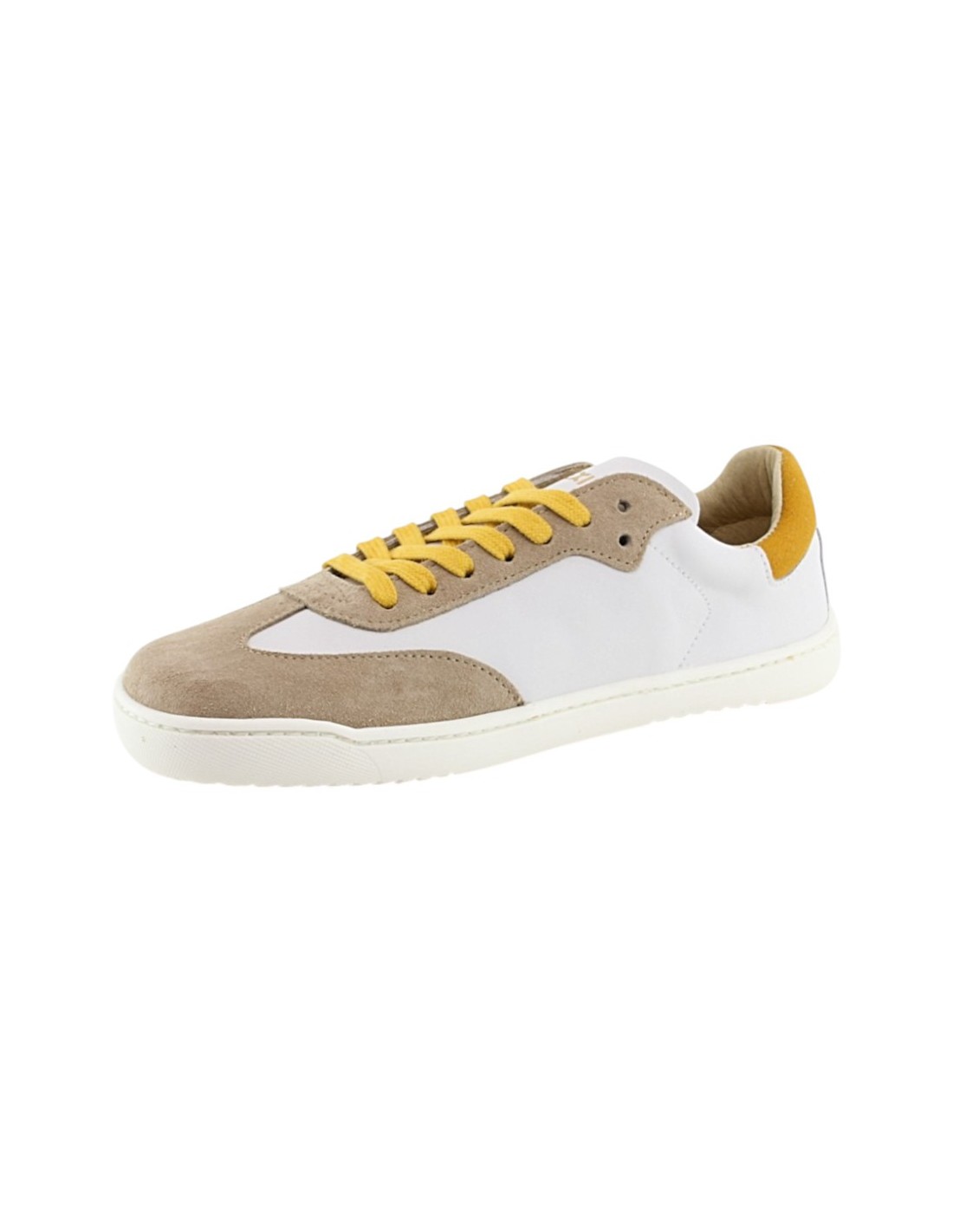 Zapatillas deportivas barefoot de la marca Flexi Nens, modelo 9026-X con suela XL de color blanco con detalles amarillos. Tienen una suela de goma muy amplia, plana y flexible que permite una gran libertad de movimiento.