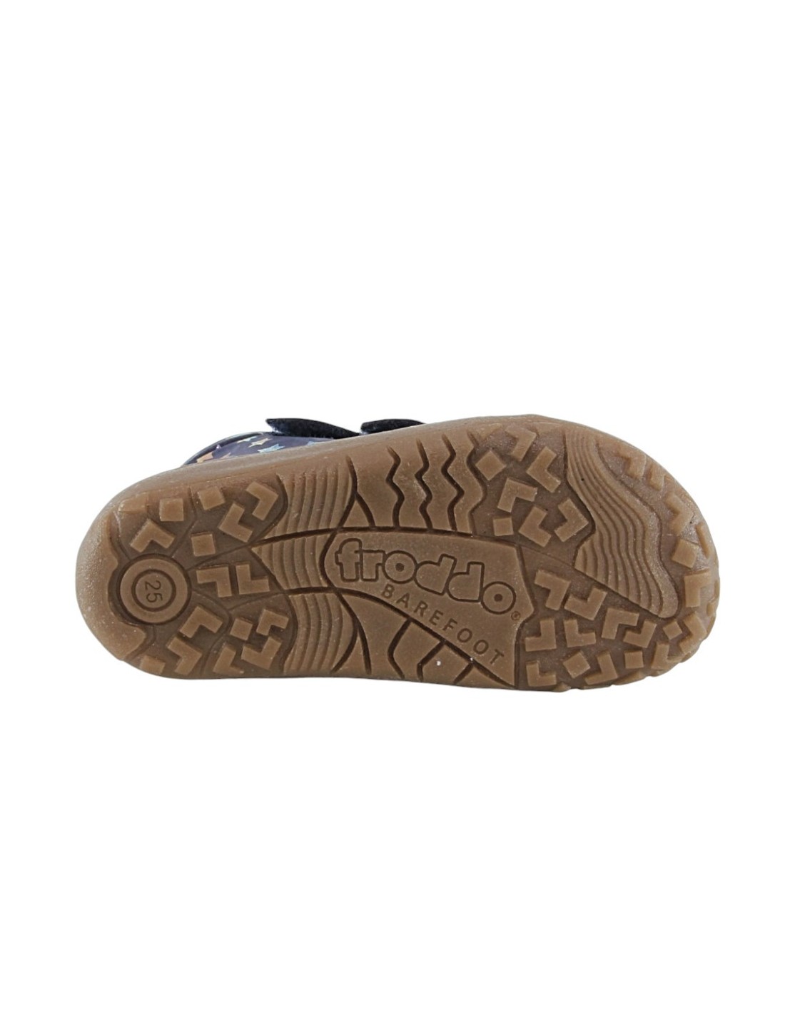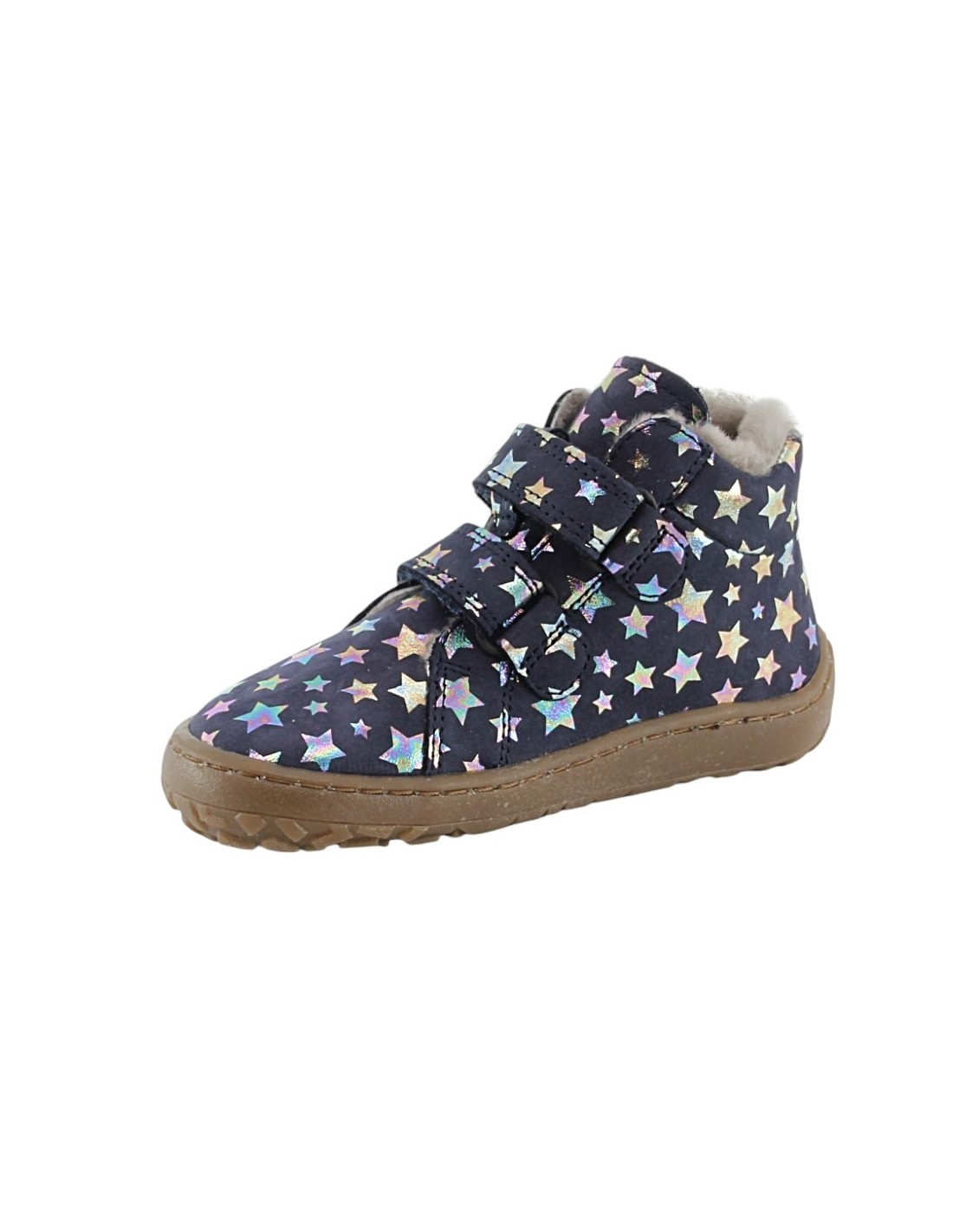 Botines barefoot de la marca Froddo, modelo con borreguito de color azúl oscuro con detalles de estrellitas multicolor. Se ajustan perfectamente a la forma natural de los pies gracias a su doble cierre con velcro y a su plantilla amplia.