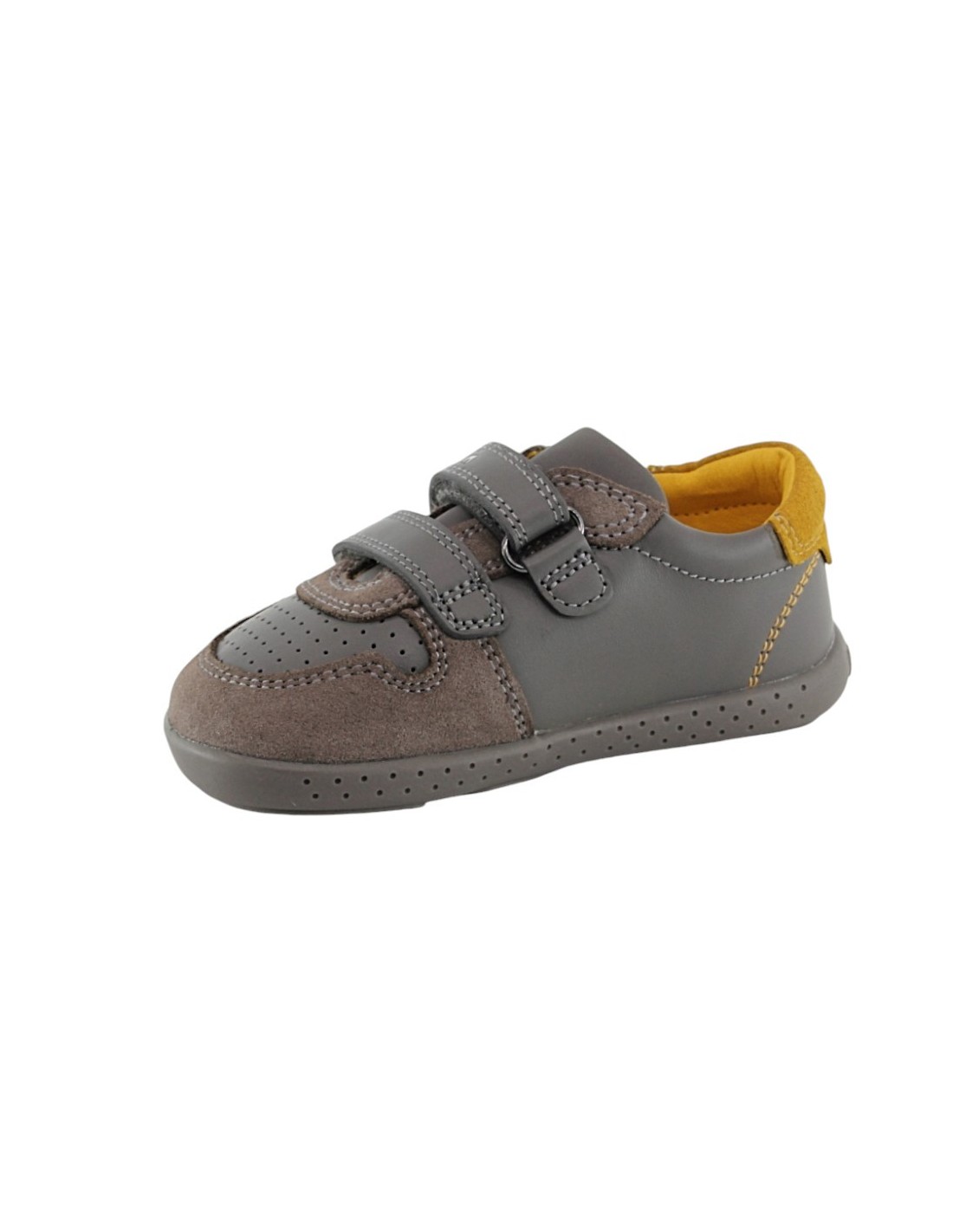 Zapatos deportivos de la marca Garvalín, modelo 241302-B213 de color gris con detalles naranjas. Son muy fáciles de poner y quitar gracias a su doble cierre con velcro. Están hechas con piel de la mejor calidad.