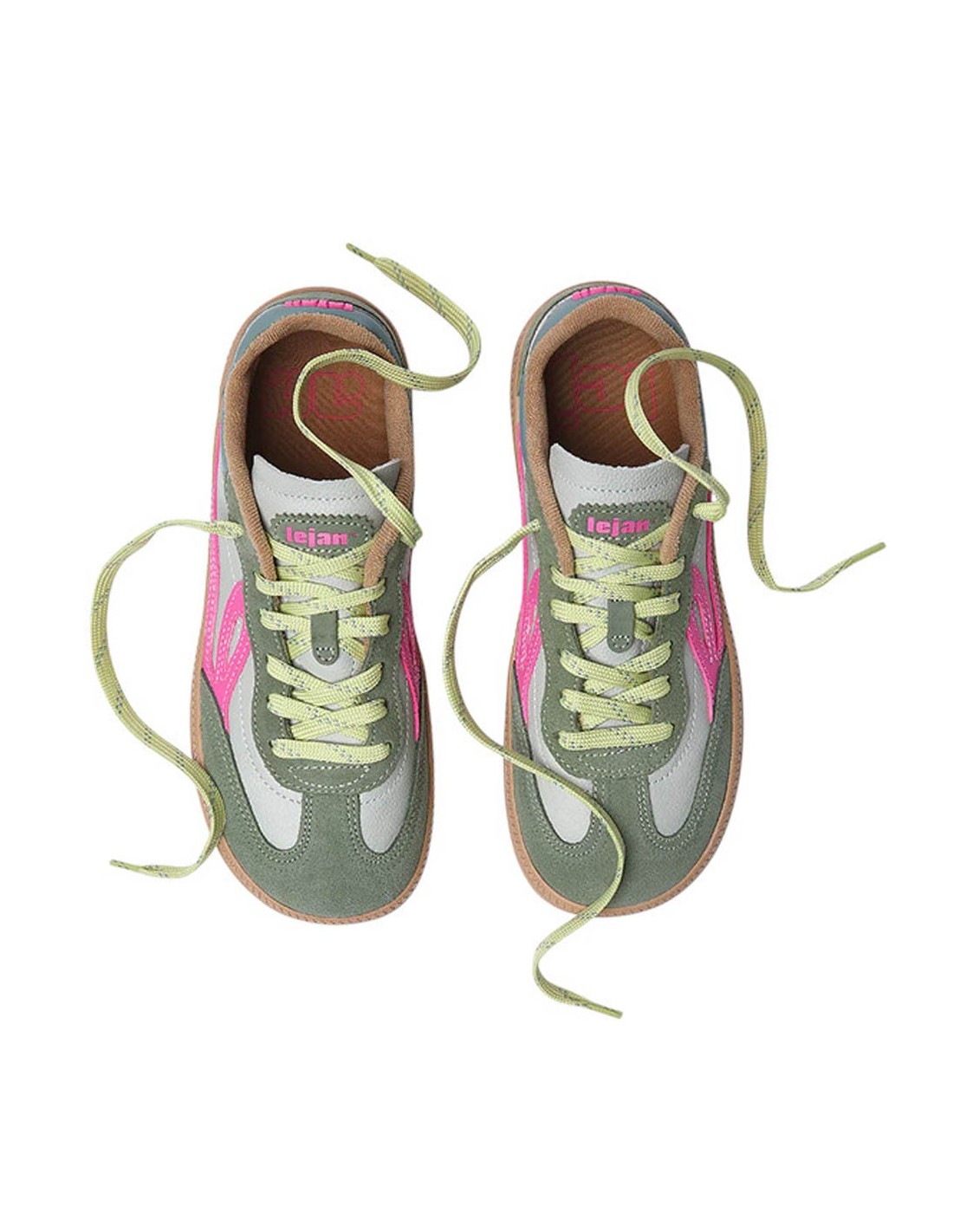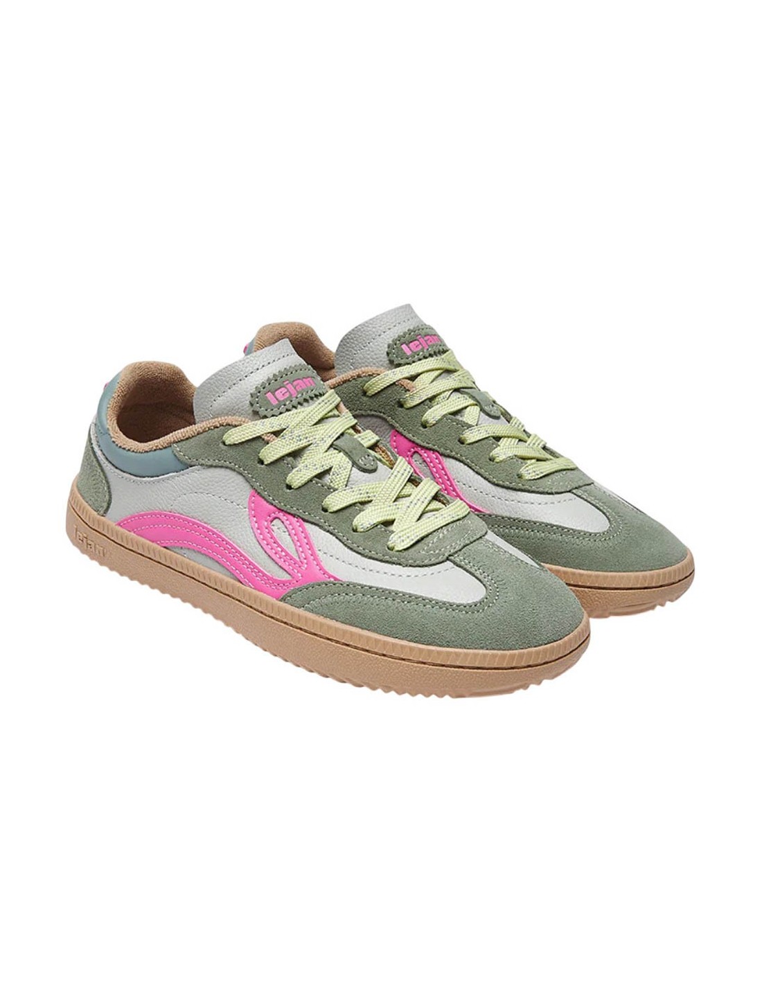 Zapatillas deportivas barefoot de la marca Lejan, modelo One de color verde mint con detalles rosas. Tienen una suela de goma muy amplia, plana y flexible que permite una gran libertad de movimiento. Calzado cómodo y estiloso.