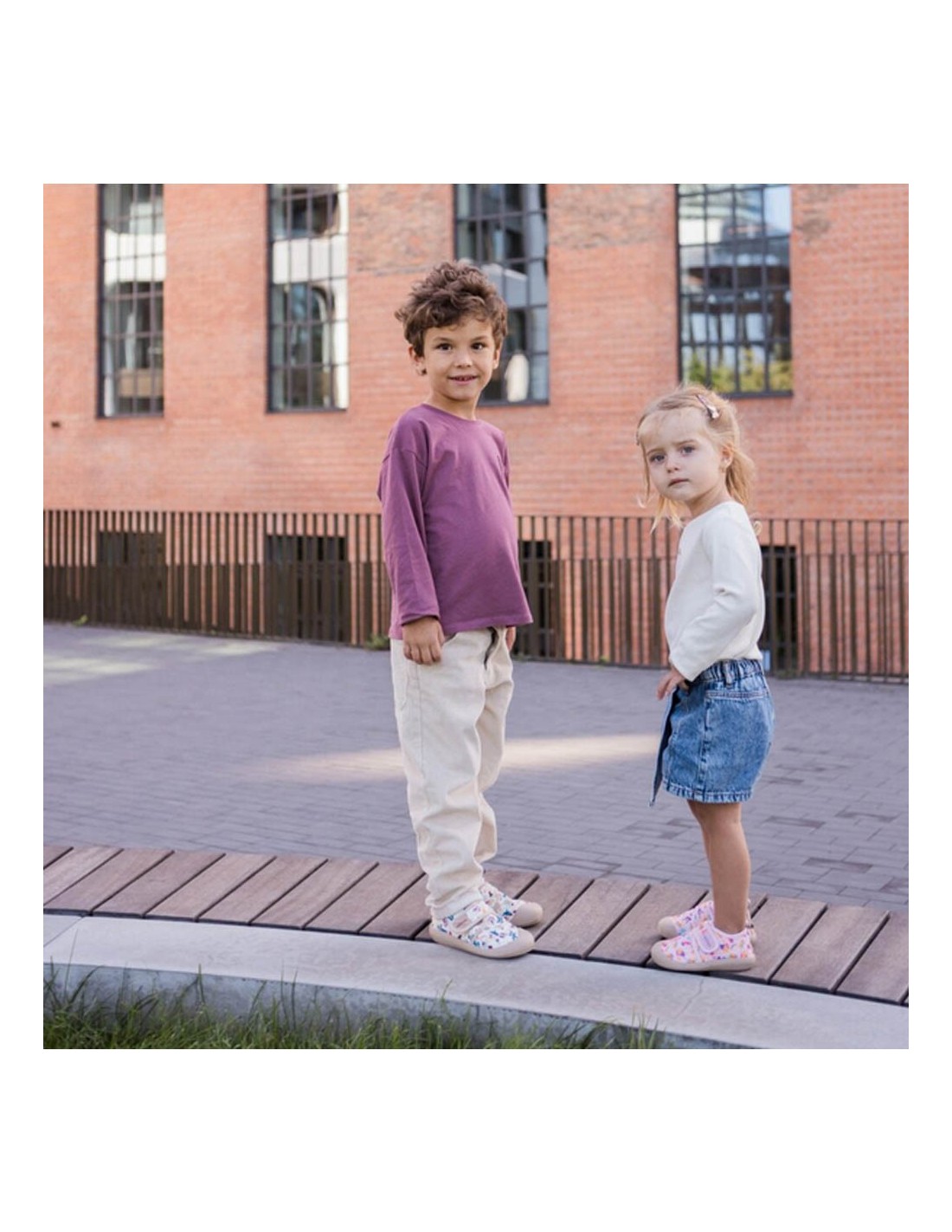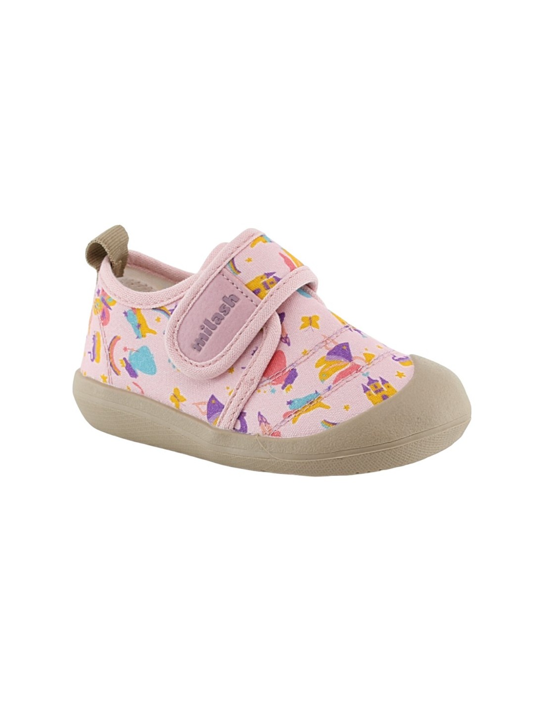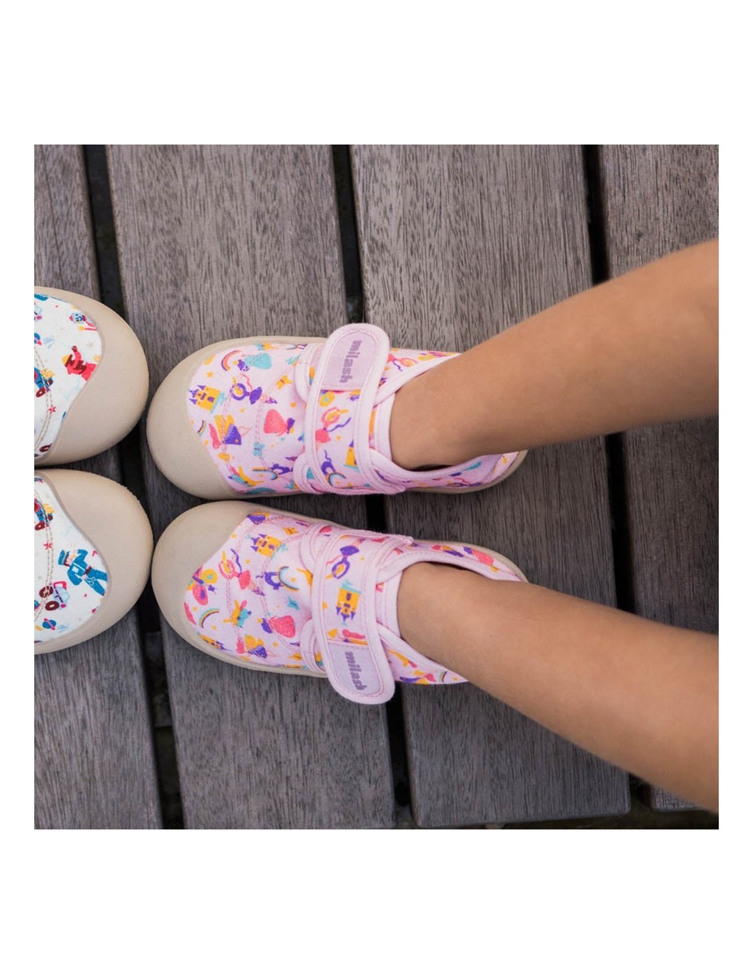 Zapatillas deportivas de lona de la marca Milash, modelo Fun Cotton de color rosa con detalles multicolor. Este calzado es respetuoso con el desarrollo y crecimiento de los pies y se ajusta perfectamente a ellos gracias a su cierre con velcro.