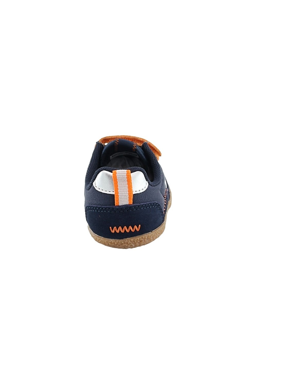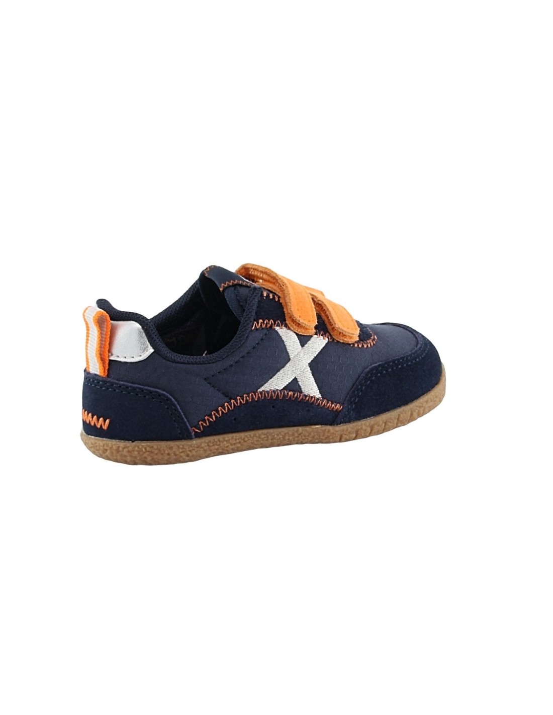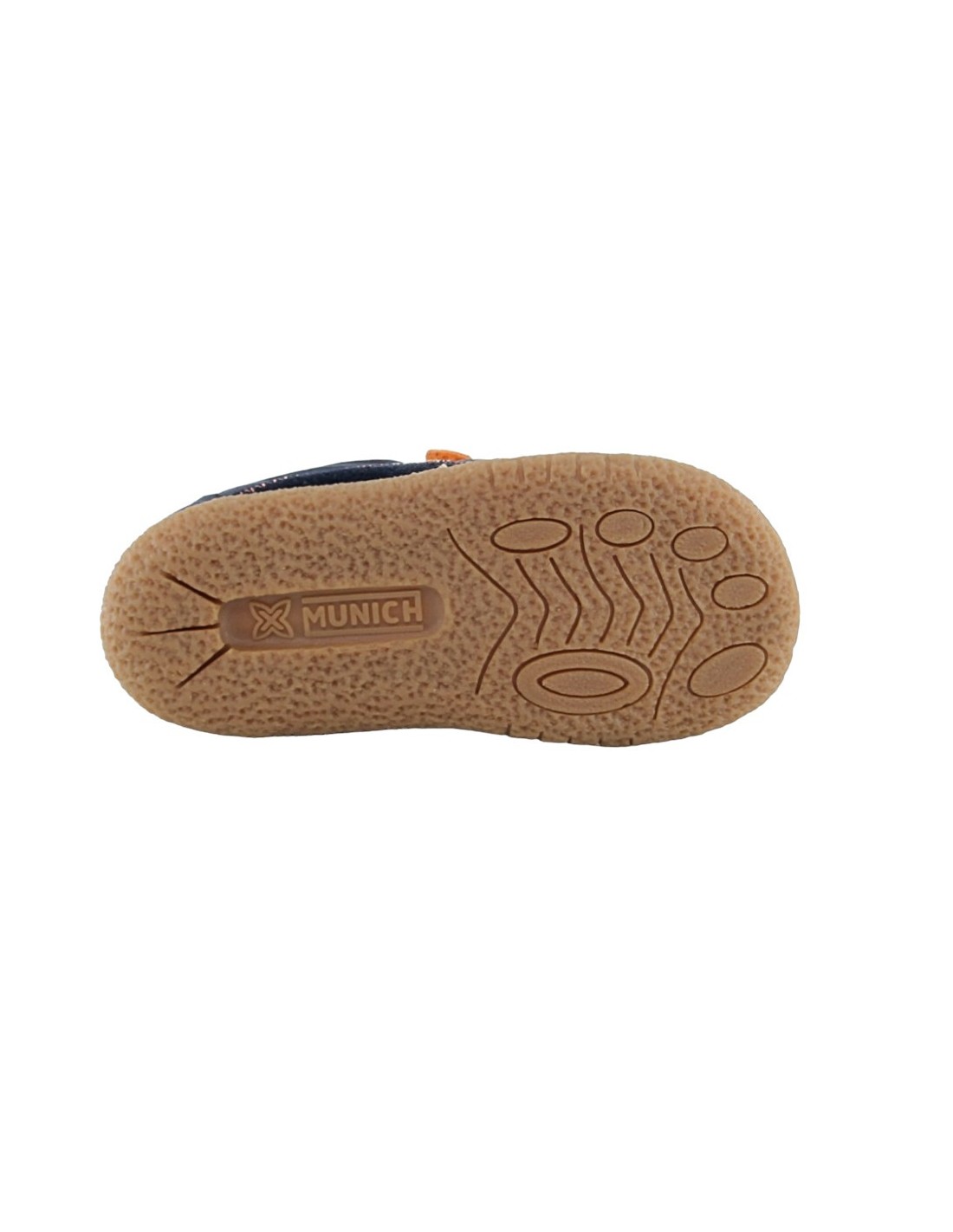 Zapatillas deportivas de la marca Munich, modelo Baby Koda de color azúl oscuro con detalles naranjas y blancos. Se ajustan perfectamente a los pies gracias a su doble cierre con velcro. Su suela de goma es muy flexible, resistente y amortiguadora.