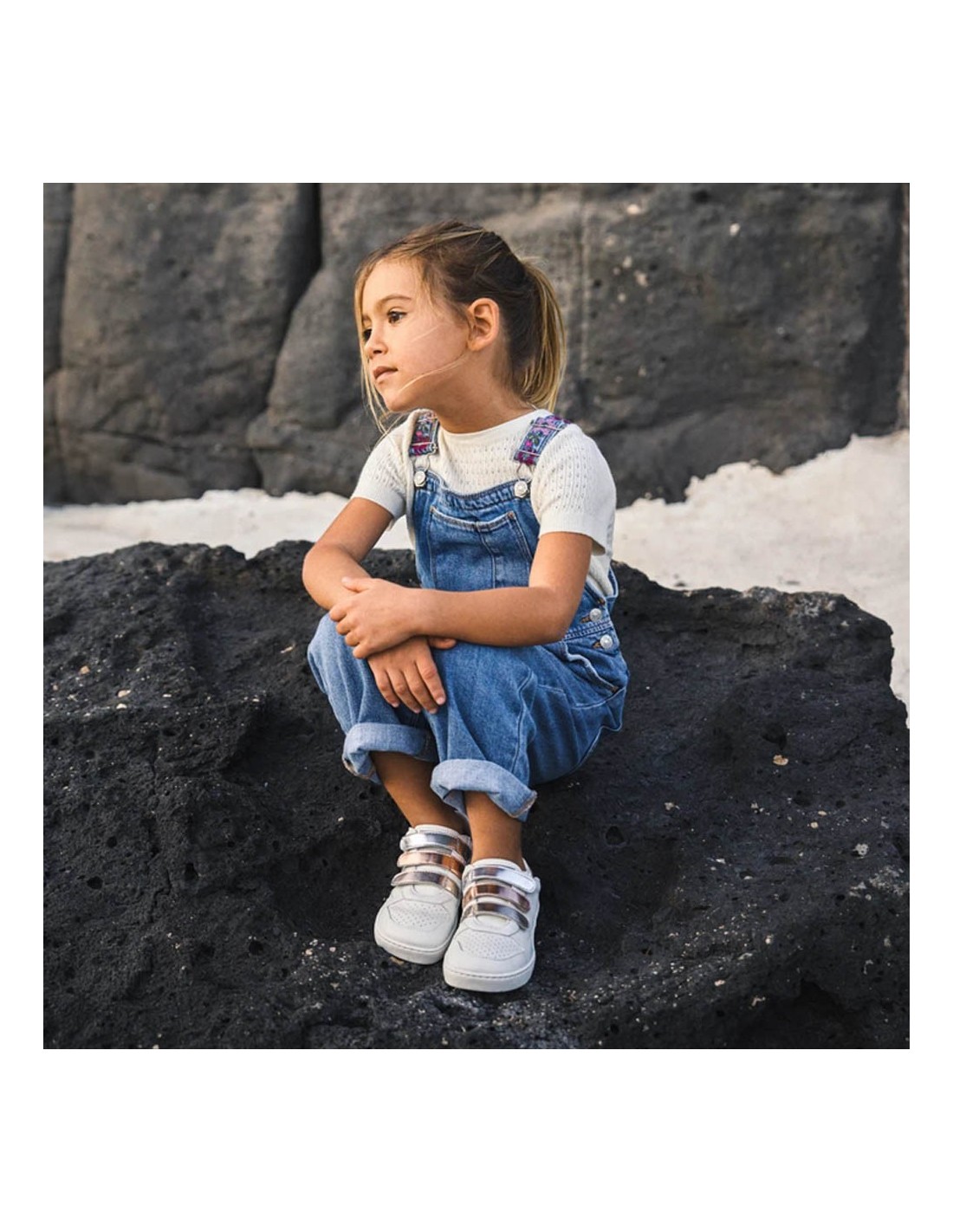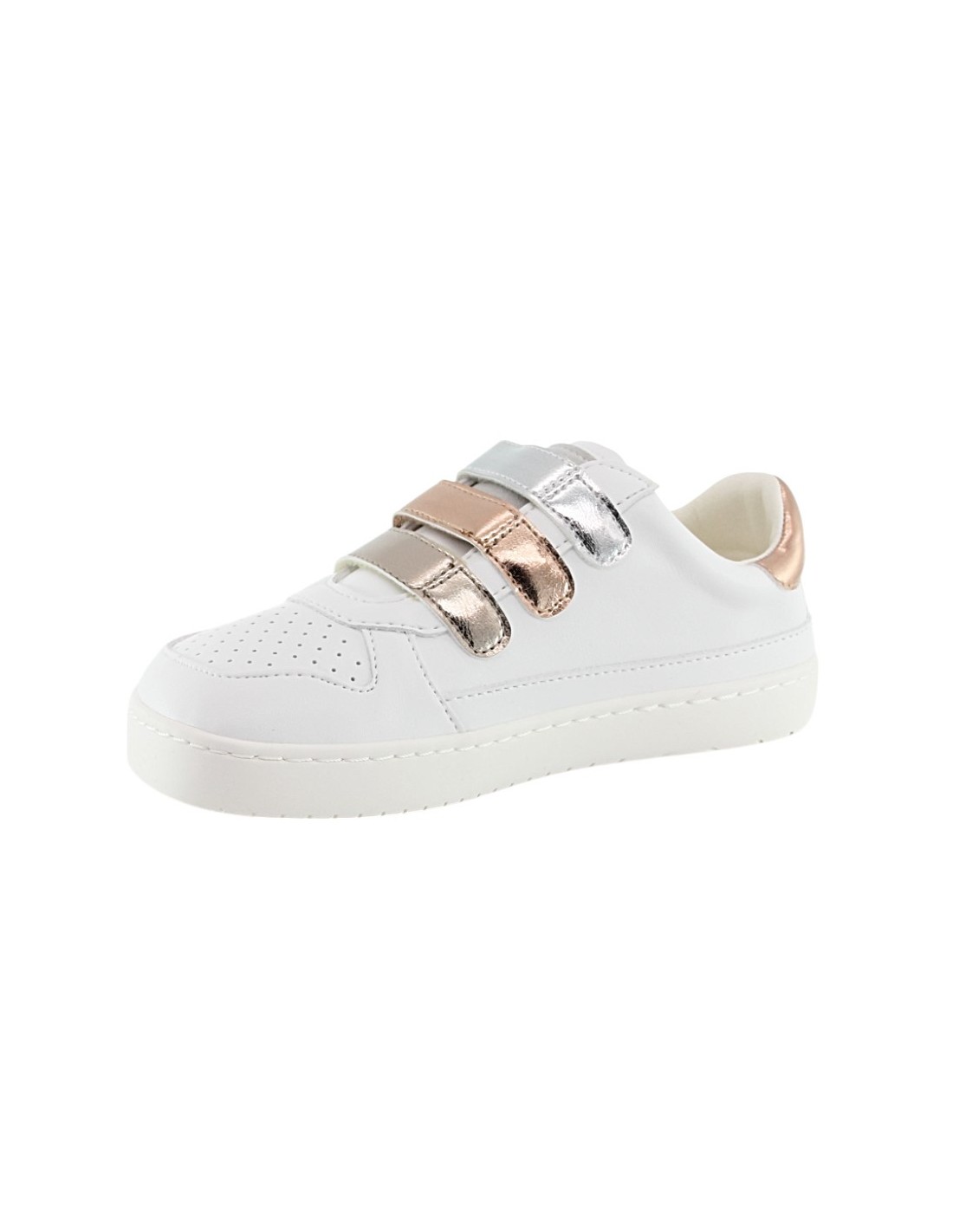 Calzado barefoot de la marca Muris, modelo London Junior de color blanco con detalles dorados. Tienen una suela de goma muy amplia, plana y flexible que permite una gran libertad de movimiento. Se ajustan a los pies gracias a su cierre con velcro.