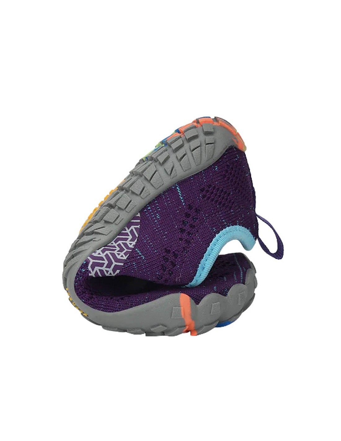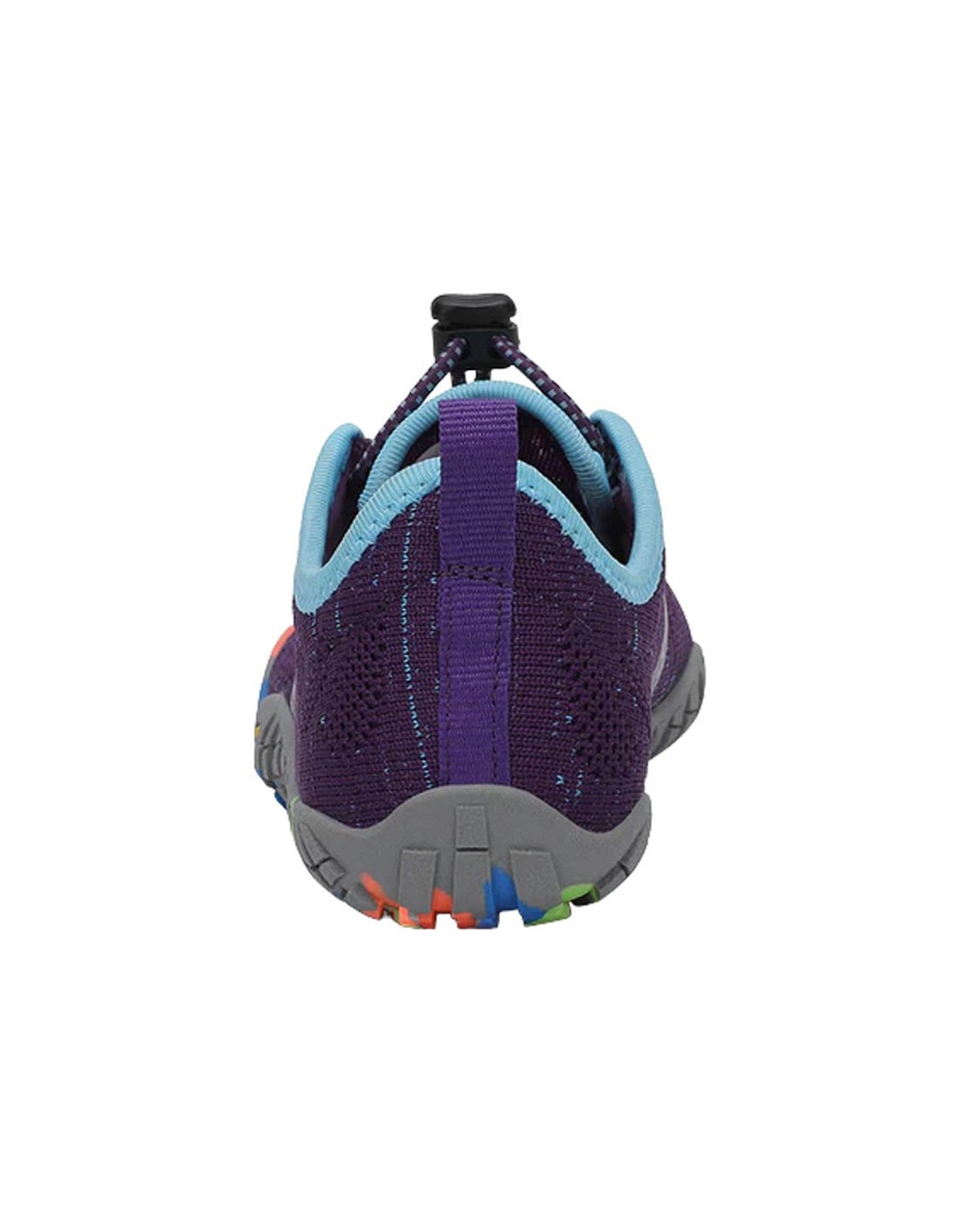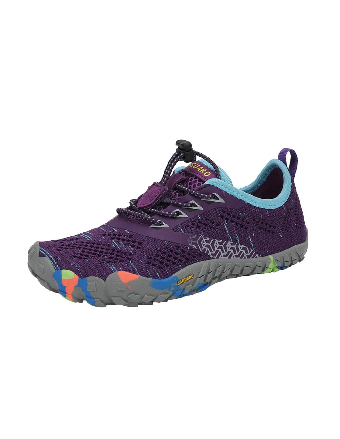Zapatillas deportivas de la marca Saguaro, modelo Chaser Smart de color lila oscuro con detalles multicolor. Este modelo de zapato barefoot busca la sensación de ir descalzo de la manera más segura posible. Son muy cómodas, estilosas y flexibles.