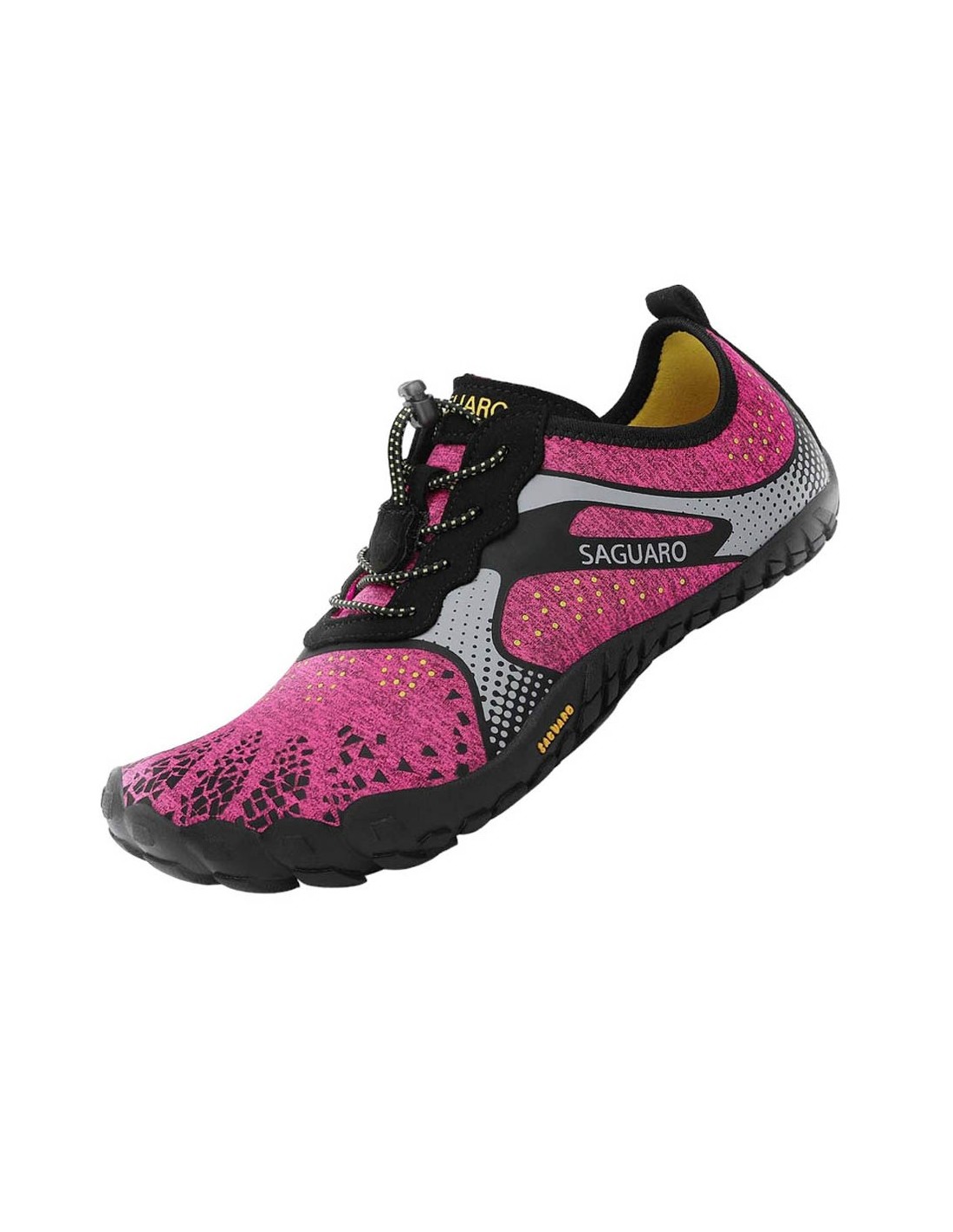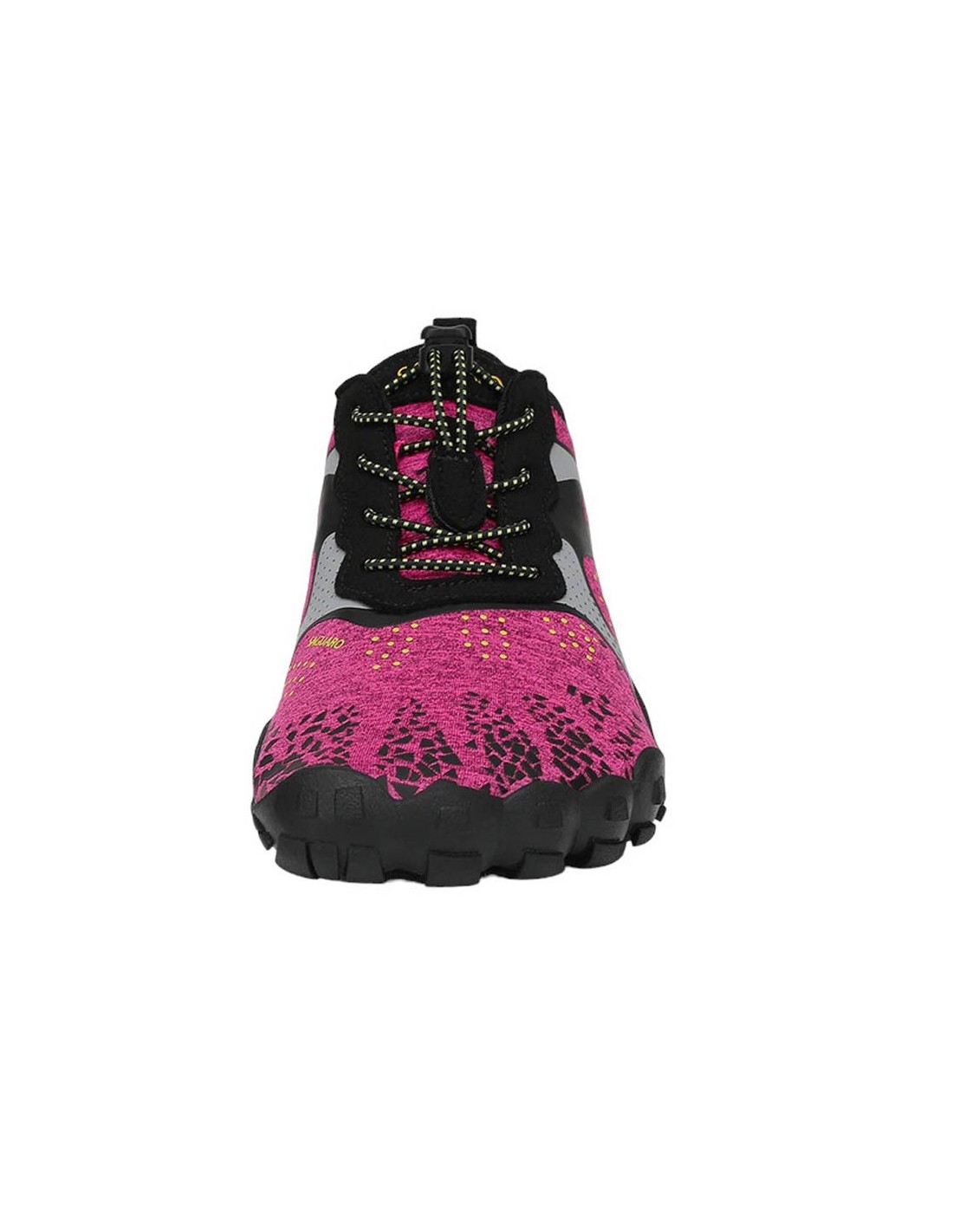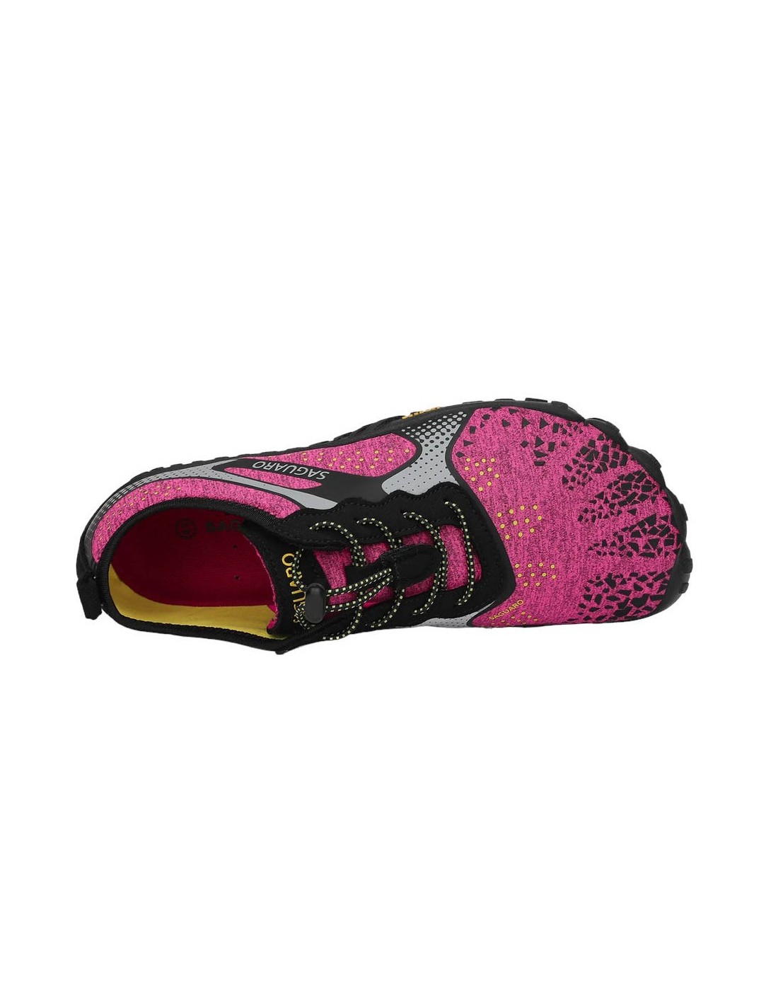 Zapatillas deportivas de la marca Saguaro, modelo Fast I de color fucsia con detalles grises. Están hechas con materiales textiles de las mejores calidades, y su suela de goma es muy ligera y flexible. Se ajustan a la forma natural de los pies.