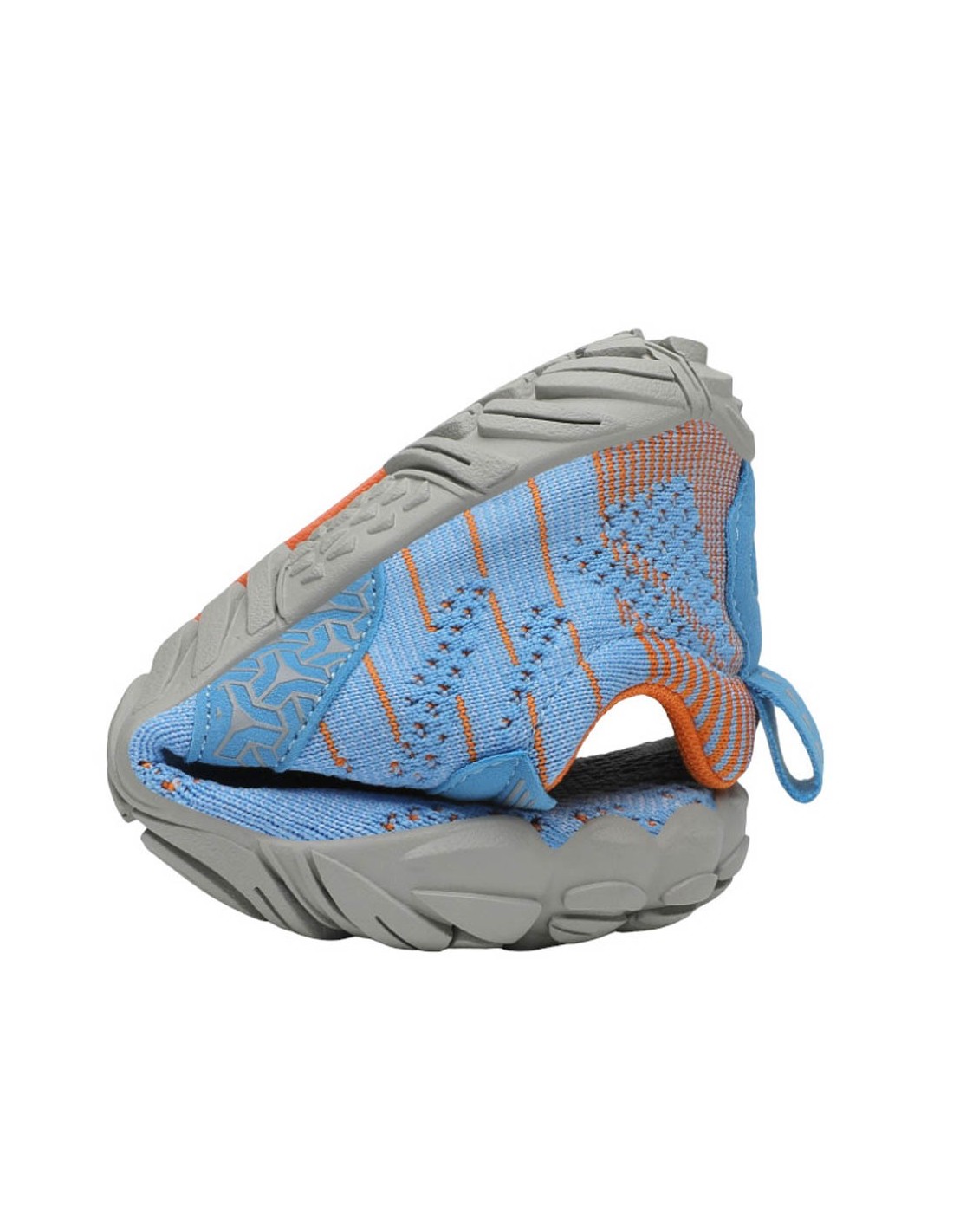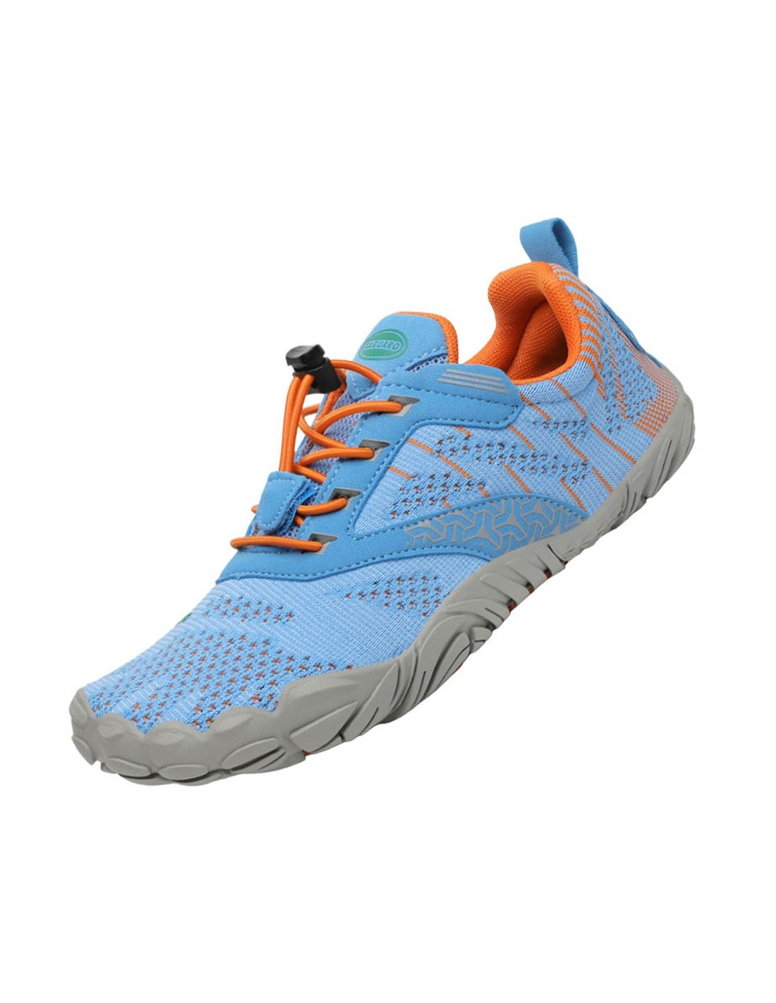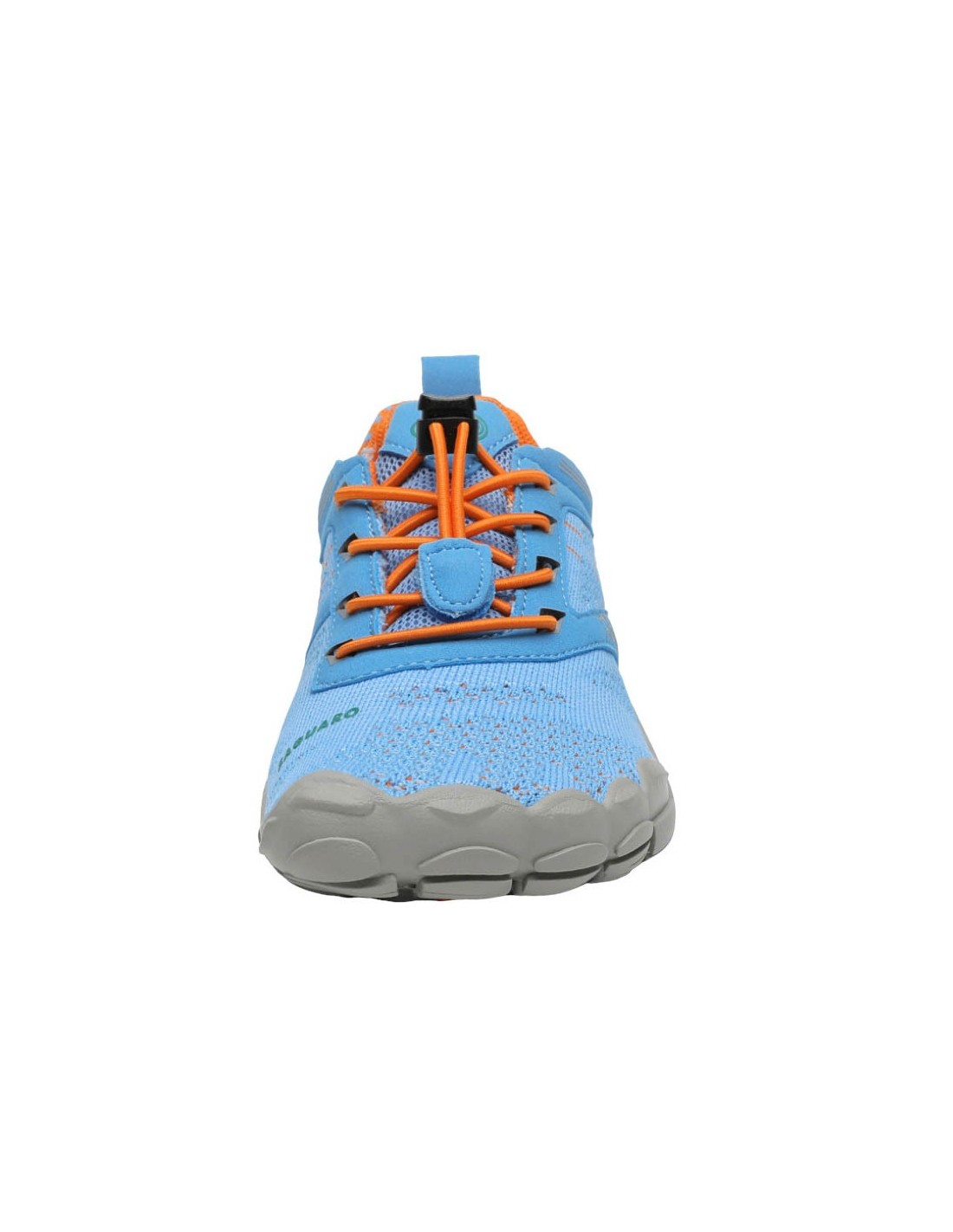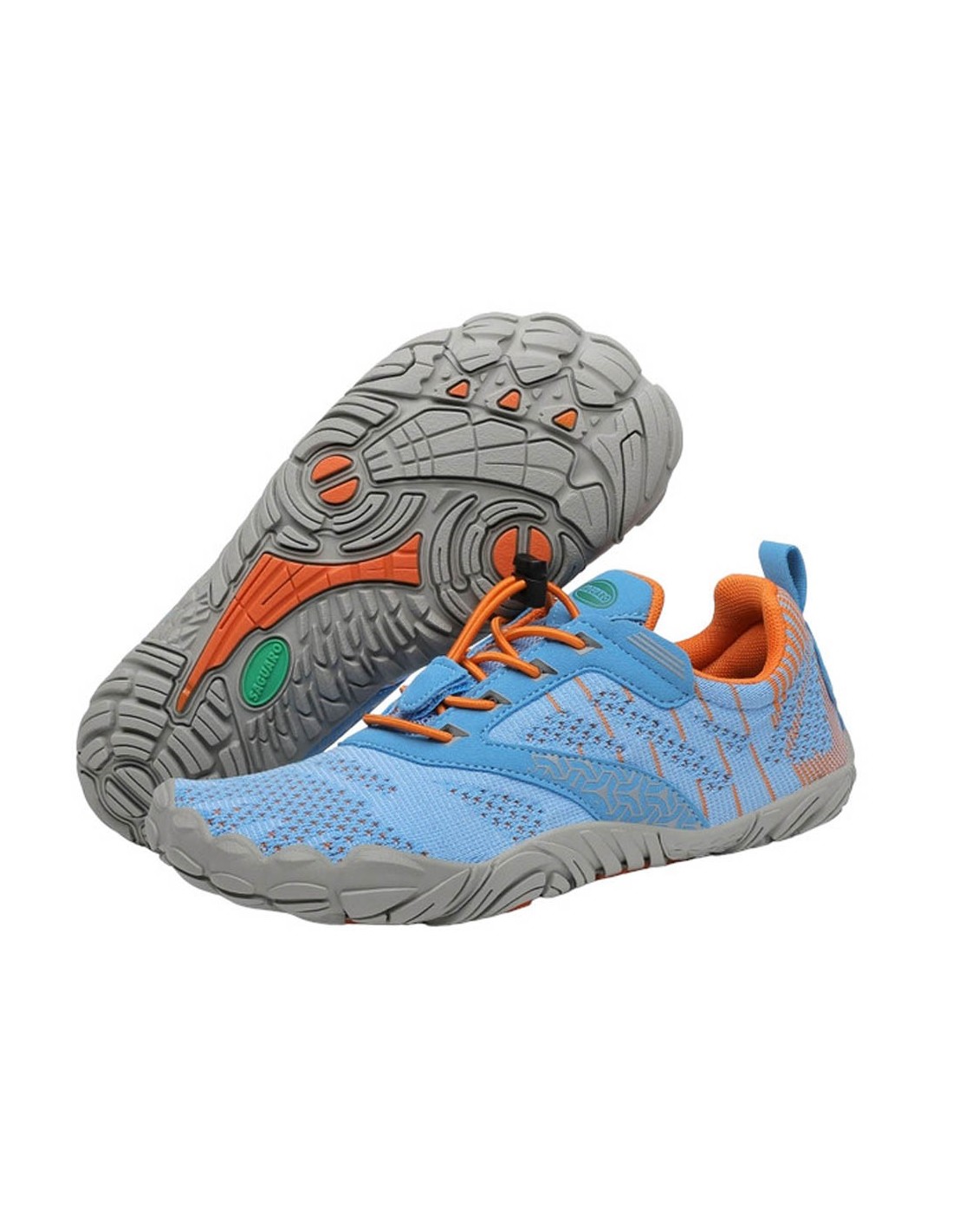 Zapatillas deportivas barefoot de la marca Saguaro, modelo Free I de color azúl Jeans con detalles naranjas. Se ajustan perfectamente a los pies gracias a sus cordones elásticos ajustables. Su suela de goma es muy flexible, plana y ligera.