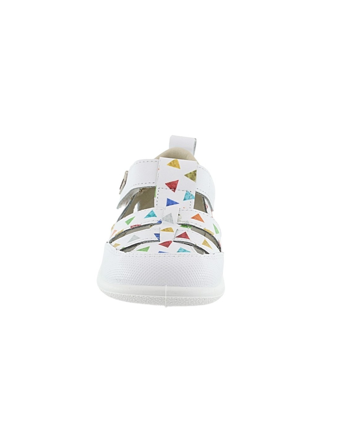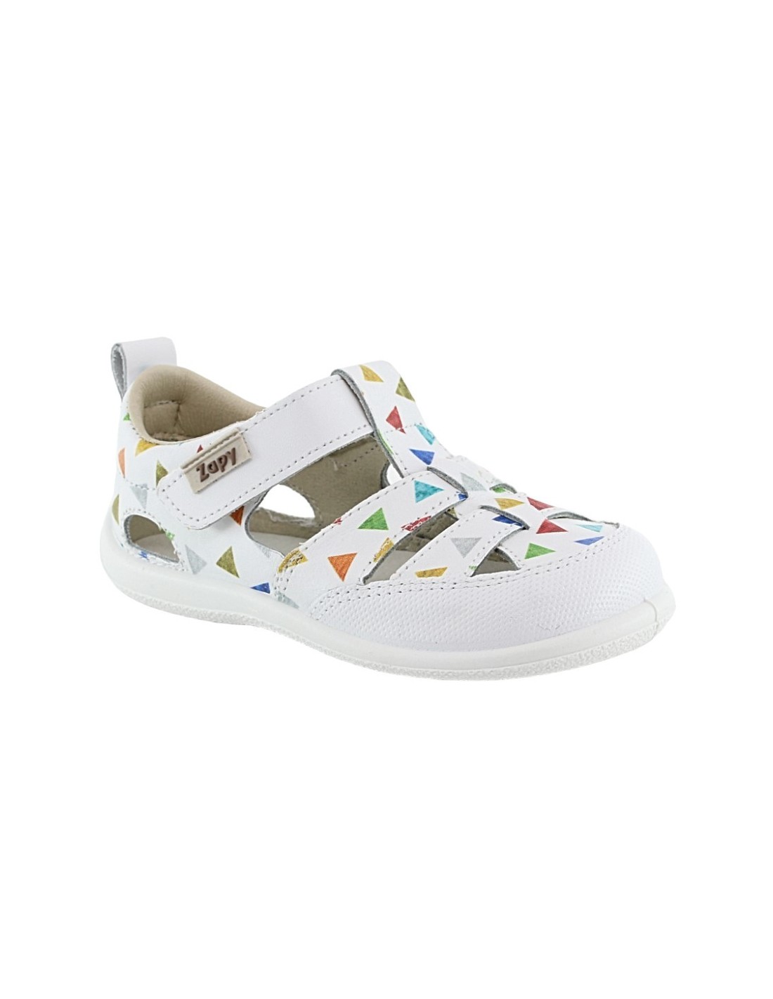 Sandalias cerradas de la marca ZapyFlex, modelo de color blanco con detalles multicolor. Se ajustan perfectamente a los pies gracias a su cierre con velcro. Su suela de goma es muy flexible y ligera, perfecta para cualquier terreno.