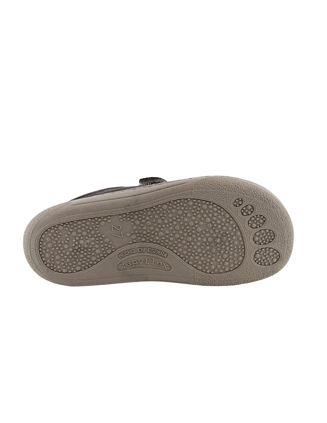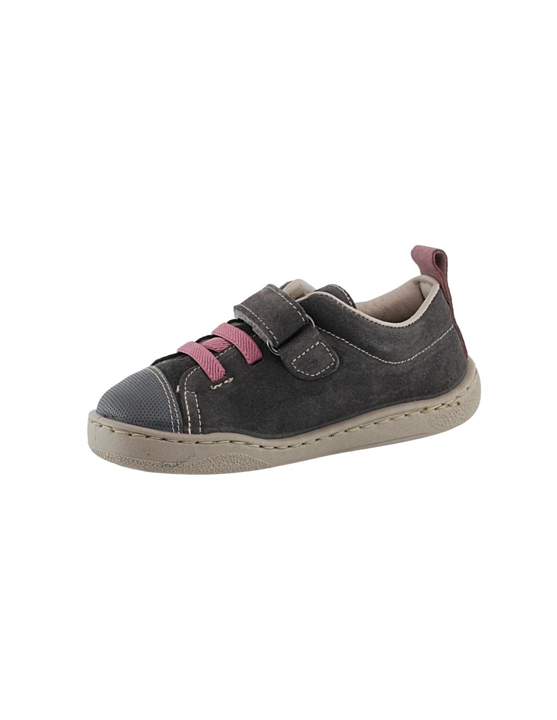 Zapatos deportivos de la marca ZapyFlex, modelo de color gris oscuro con detalles fucsias. Se ajustan perfectamente a los pies gracias a su cierre con velcro y con cordones elásticos. Calzado respetuoso con el crecimiento natural de los pies.
